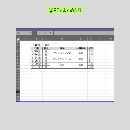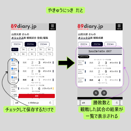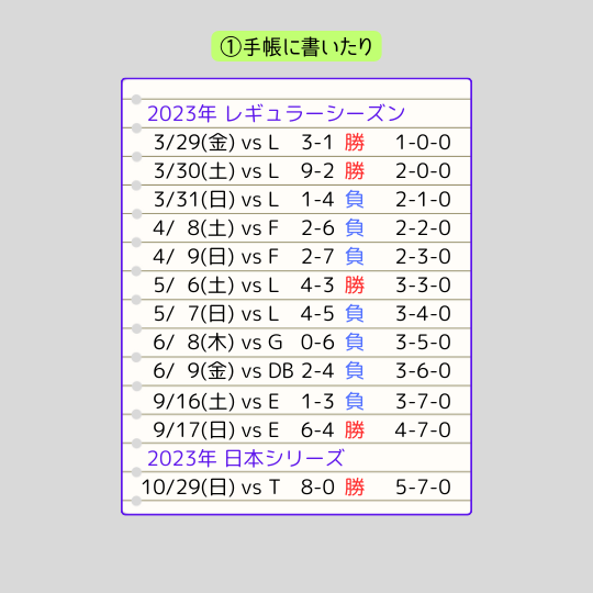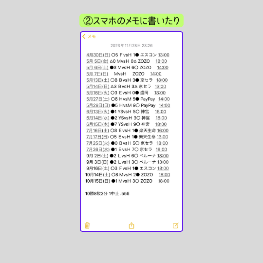 今までは観戦した試合の日付や対戦相手・球場・スコアを個人で ①「手帳に書いたり」 ②「スマホのメモに書いたり」 ③「PCでまとめたり」 するといった手間のかかる観戦成績が手軽にまとめれるようにできます。